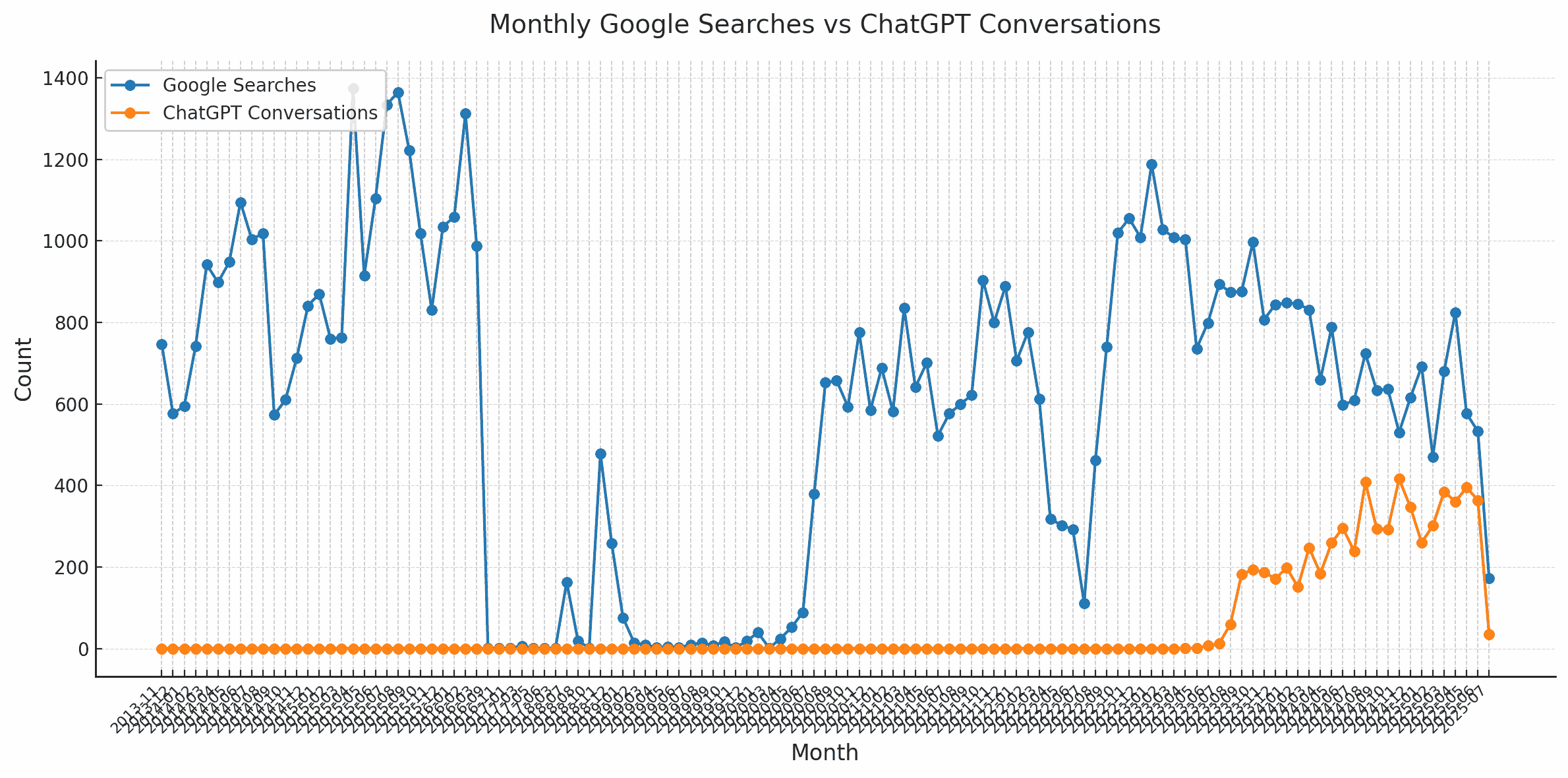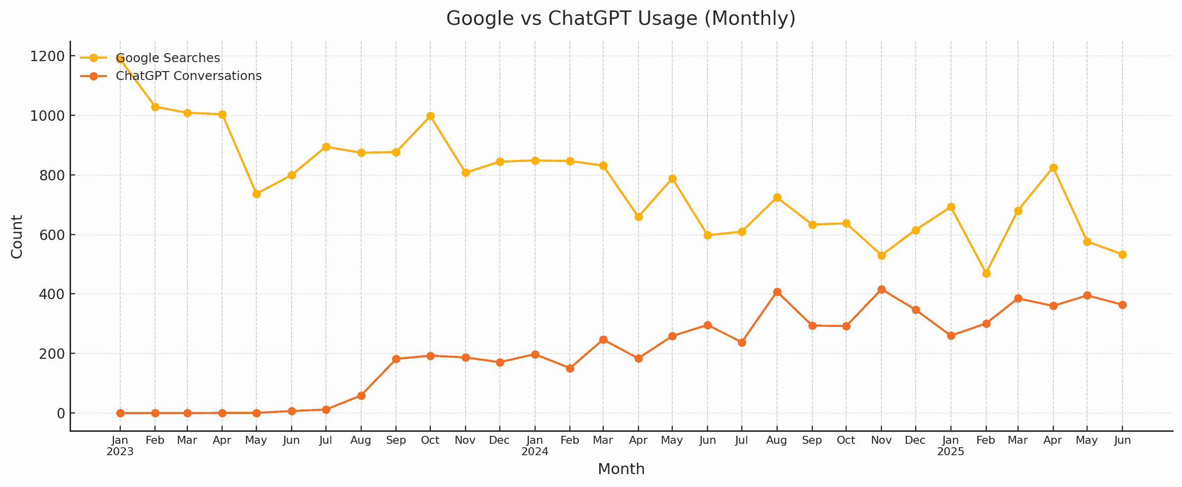 From Sep 2023 - Feb 2024, my Google usage was 5x ChatGPT. Then, fell to 3x until May 2024. Then about 2x until Apr 2025. Since May 2025, it sits at the 1.5x mark.