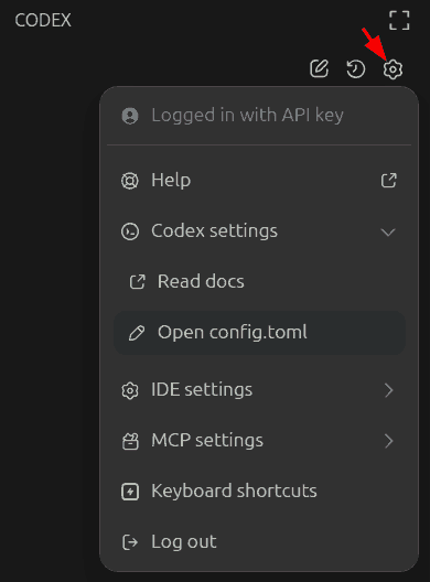 Click on the gear-like settings icon to the right of the Codex pane, then Codex settings, then Open config.toml.