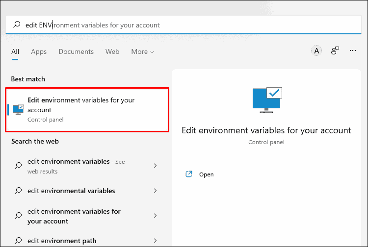 Search for “Edit environment variables for your account” in the Windows search bar.